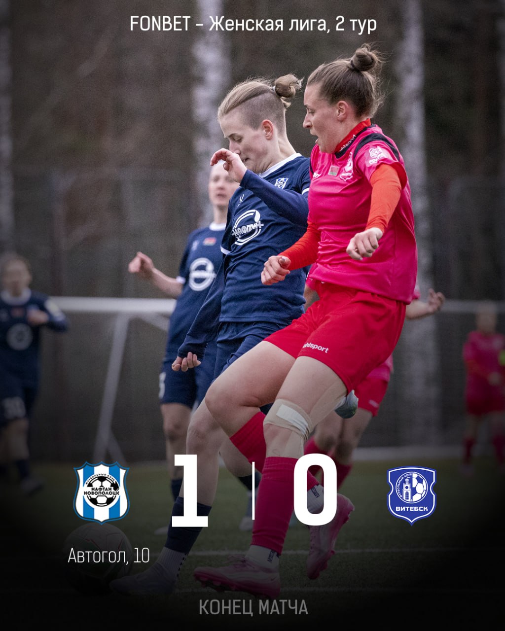 Одерживаем минимальную победу в матче 2 тура против женского футбольного клуба «Витебск»! Единственный гол в «северном дерби», после удара Карины Станкевич, на счету игрока соперника, которая поразила собственные ворота!