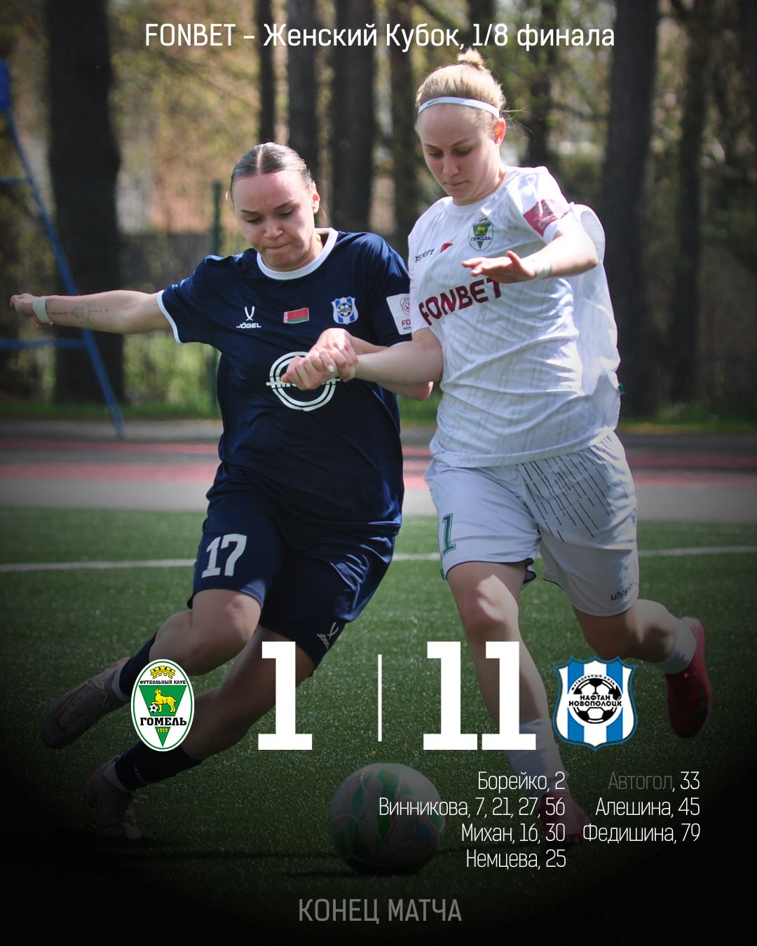 11 мячей забили наши девушки в сегодняшнем матче! Увидели не только первый хет-трик в истории нашей команды, но и покер! Светлана Винникова отличилась на 7, 21, 27 и 56 минутах! Дубль на счету Дарьи Михан и по голу забили Полина Борейко, Софья Немцева, Александра Алешина и Анастасия Федишина! Ещё один мяч футболистки «Гомеля» забили в свои ворота.